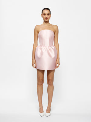 The Luetta Mini is a perfect blend of sweet and elegant. Designed with a curved strapless neckline that gracefully blends into a flirtatious bubble mini skirt with detailed ruching. Made with structured shaping through the bodice for a sleek silhouette. Crafted in our luxurious heavyweight satin for beautiful feel on the body.