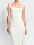 Romantic and tender, the Merle Gown is imagined in both Raspberry and Ivory — shades that speak of softness and strength. Merle features a classic neckline, with delicate ruching across the hips that seamlessly blends into a romantic train. Made for spring weddings, outdoor celebrations, or evenings where colour becomes mood.